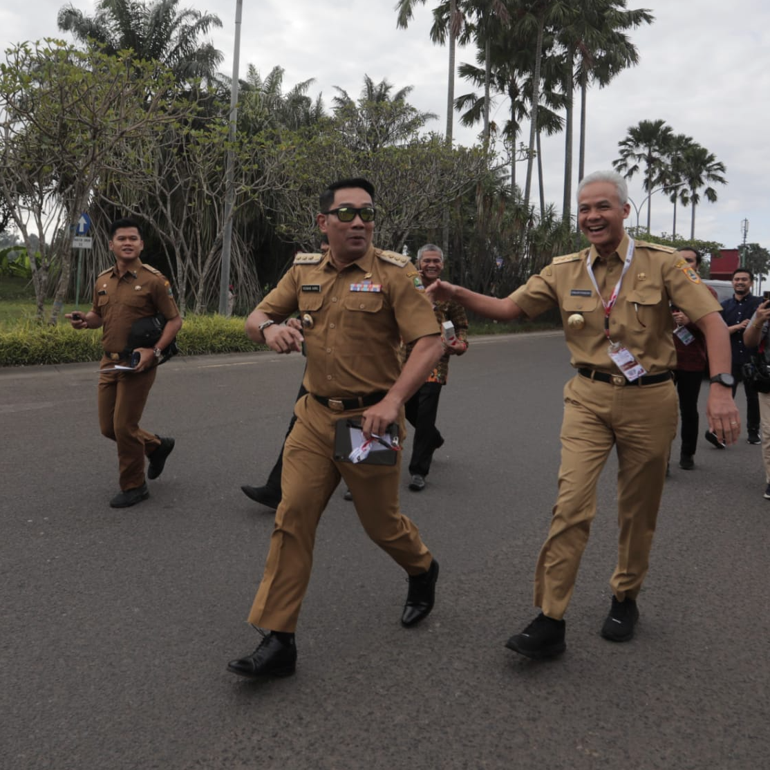 Gubernur Jawa Barat Ridwan Kamil dan Gubernur Jawa Tengah Ganjar Pranowo berlari menuju lokasi acara Rakornas Kepala Daerah dan Forkopimda Tahun 2023 di Sentul International Convention Centre (SICC), Kota Bogor, Selasa (15/1/2023).(Foto: Yogi Prayoga